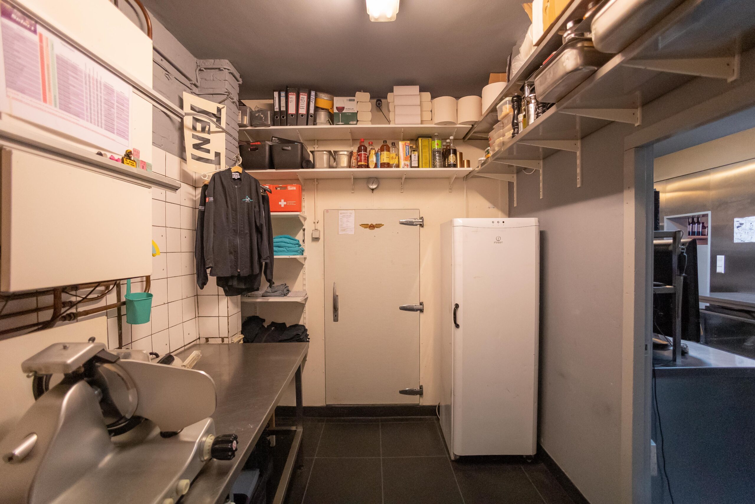 Van achter de bar betreed je de halfopen keuken van ca. 18 m² met houtskoolgrill, een groot fornuis en andere professionele keukenapparatuur. Aan beide zijden is genoeg ruimte voor grote werkbanken. Achter de keuken ligt de secundaire productieruimte, voorzien van een ruime koelcel en een werkbank, waar ook plek is voor opslag.