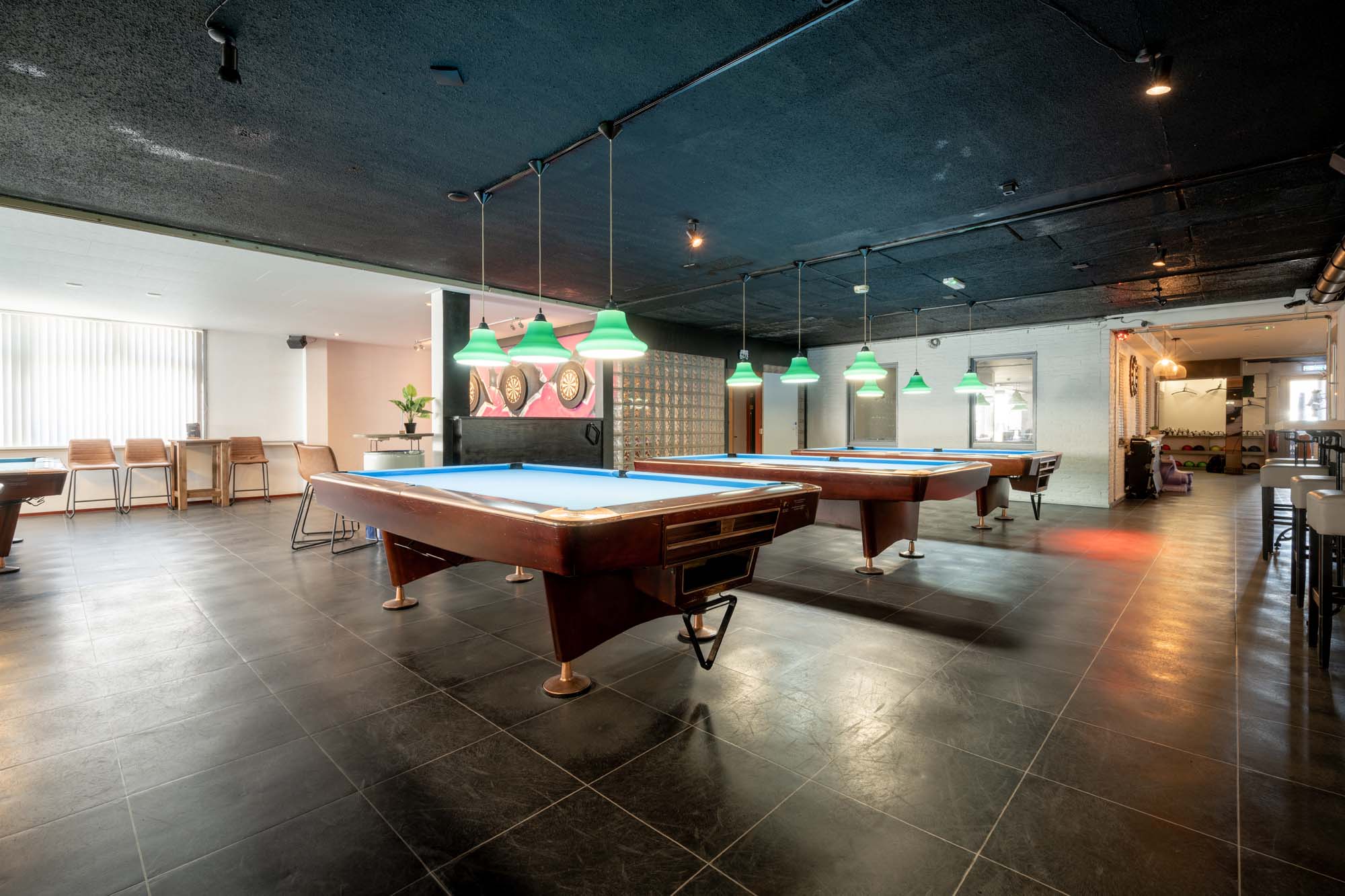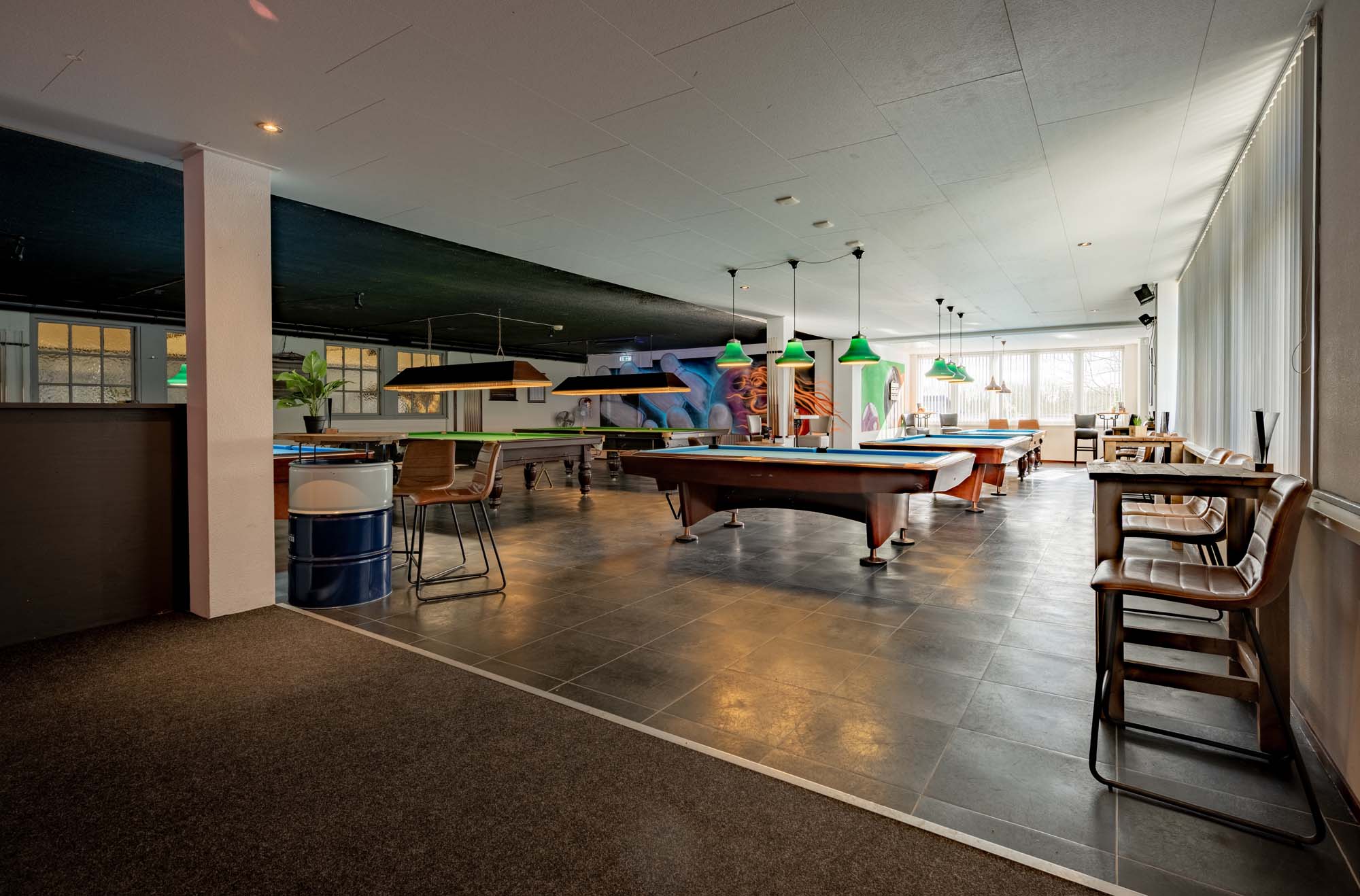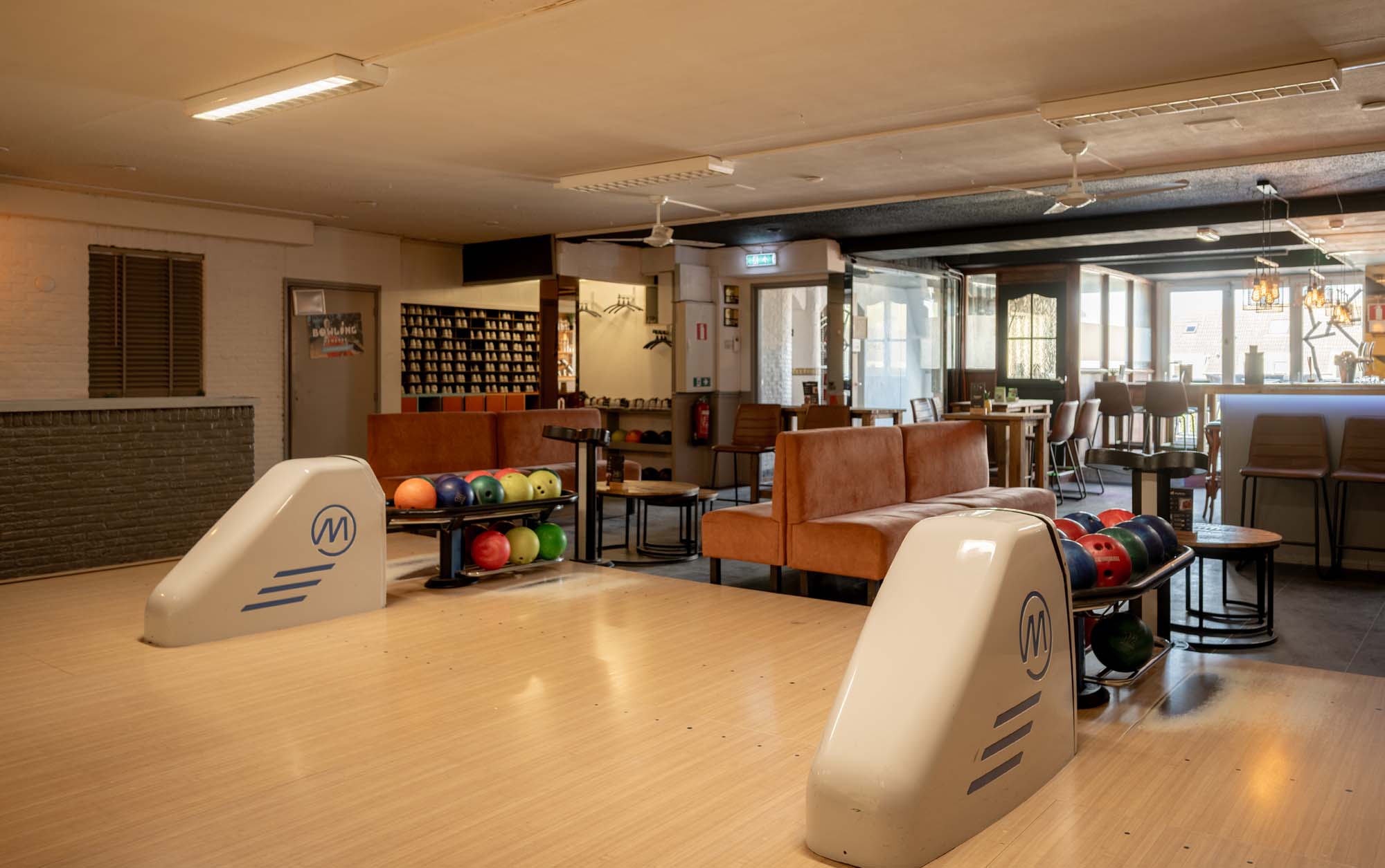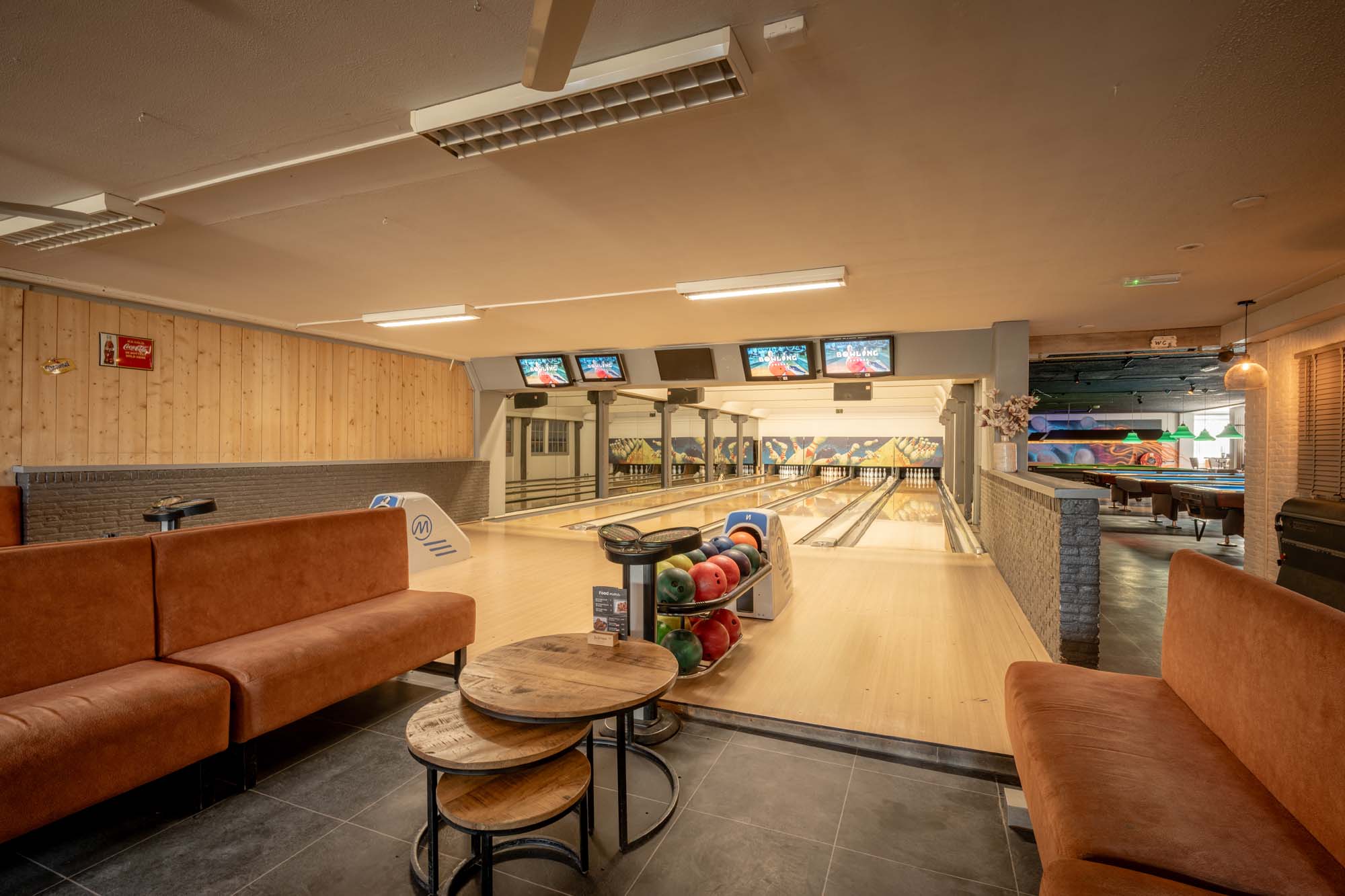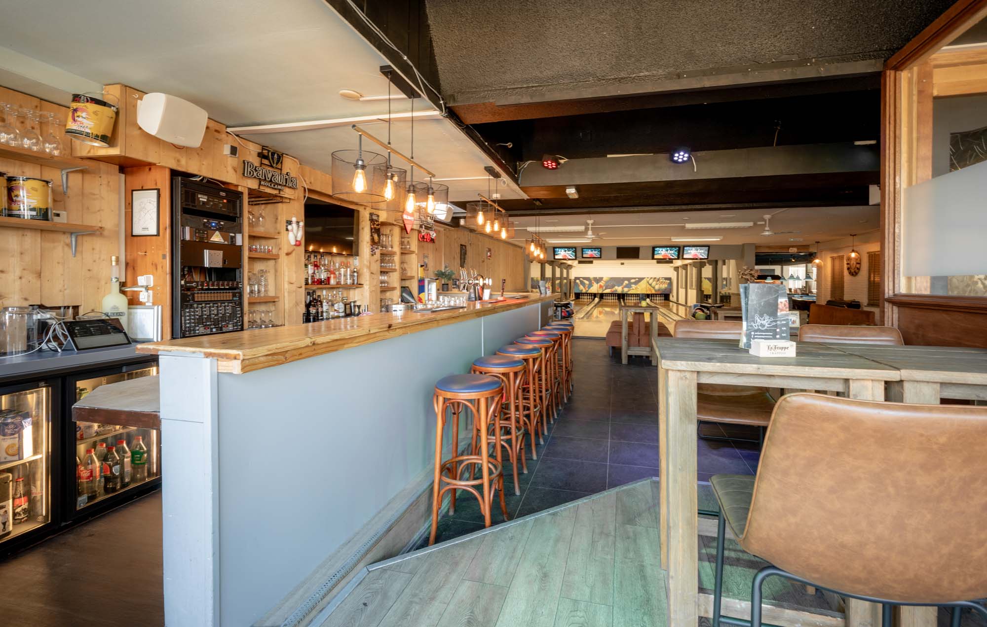 Wie de trap naar de eerste verdieping neemt en rechtdoor loopt komt in een grote ruimte van maar liefst 800 m2. Hier vind je 4 bowlingbanen, 5 pooltafels, 2 snookertafels, 1 biljart en 3 dartborden. Tal van sporten dus op één plek. De bowlingbanen zijn zodanig in trek dat reserveren nodig is. Wat betreft de keusporten, kun je binnenlopen en kijken welke tafel vrij is. Darten kan gratis op elk bord dat vrij is. In deze ruimte vind je daarnaast een aantrekkelijke bar van waaruit iedereen bediend wordt. Daar staat onder andere een goede koffiemachine, muziekinstallatie en vitrinekoelkasten. Je vindt hier een frituurhoek voor de snacks die gasten bij hun drankje kunnen bestellen.
