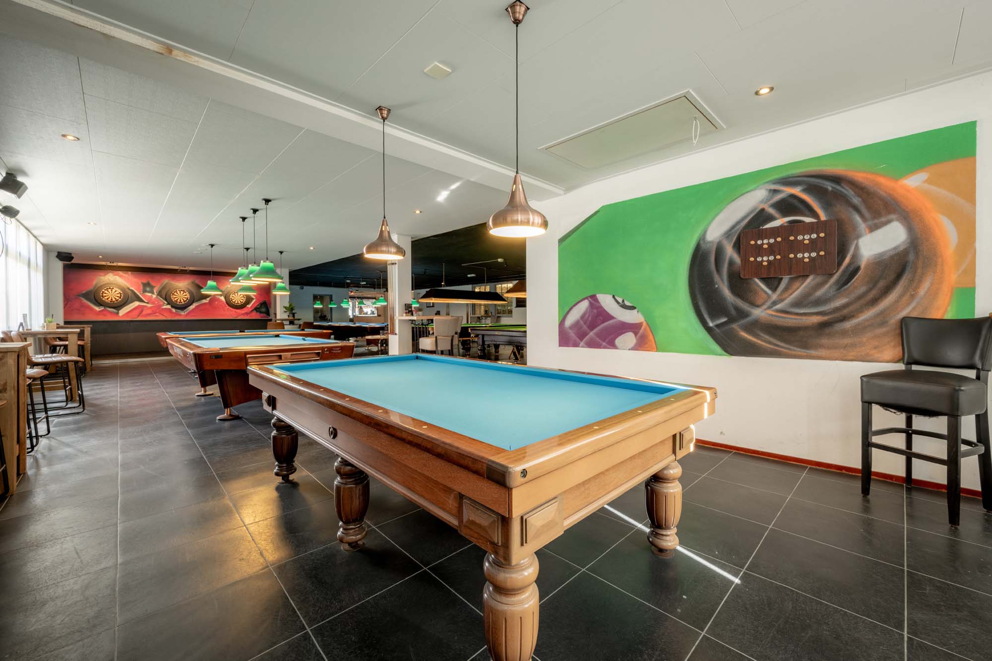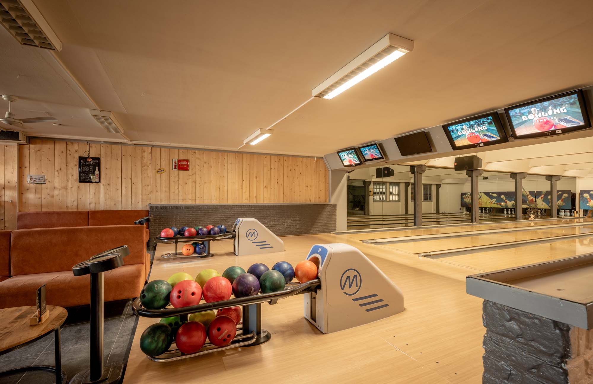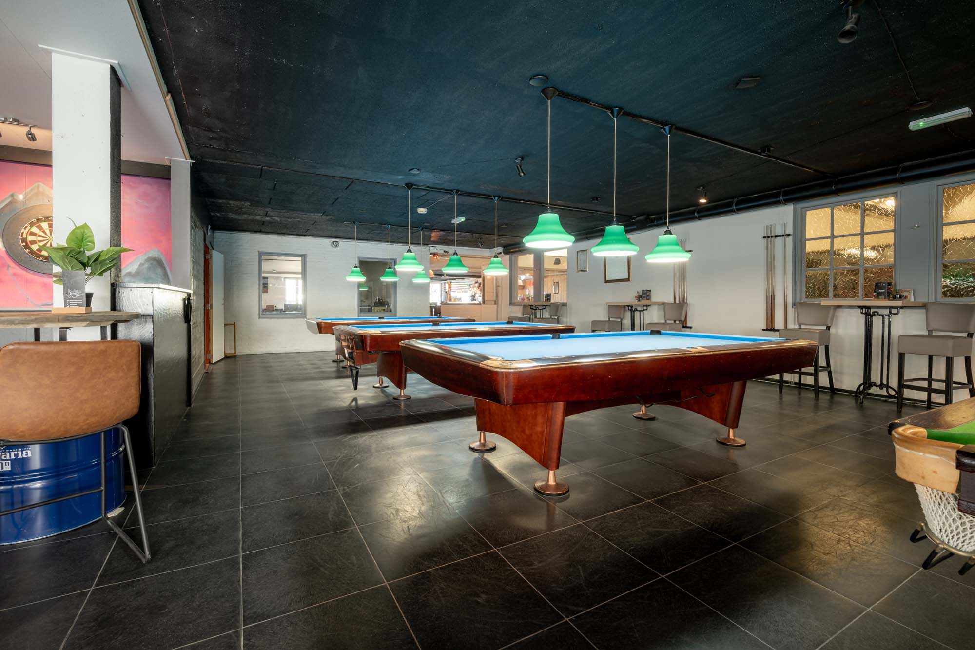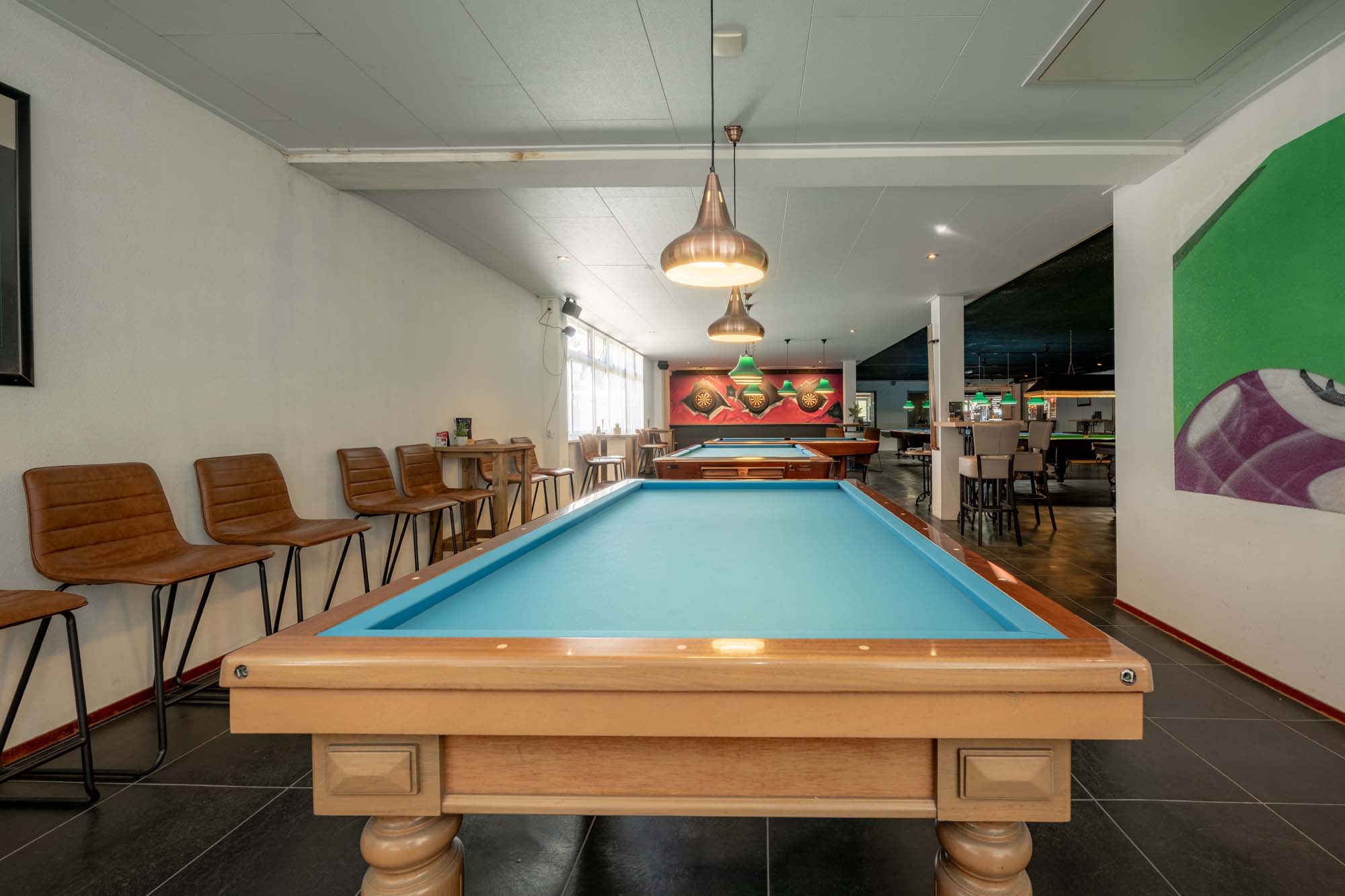 Wie de trap naar de eerste verdieping neemt en rechtdoor loopt komt in een grote ruimte van maar liefst 800 m2. Hier vind je 4 bowlingbanen, 5 pooltafels, 2 snookertafels, 1 biljart en 3 dartborden. Tal van sporten dus op één plek. De bowlingbanen zijn zodanig in trek dat reserveren nodig is. Wat betreft de keusporten, kun je binnenlopen en kijken welke tafel vrij is. Darten kan gratis op elk bord dat vrij is. In deze ruimte vind je daarnaast een aantrekkelijke bar van waaruit iedereen bediend wordt. Daar staat onder andere een goede koffiemachine, muziekinstallatie en vitrinekoelkasten. Je vindt hier een frituurhoek voor de snacks die gasten bij hun drankje kunnen bestellen.