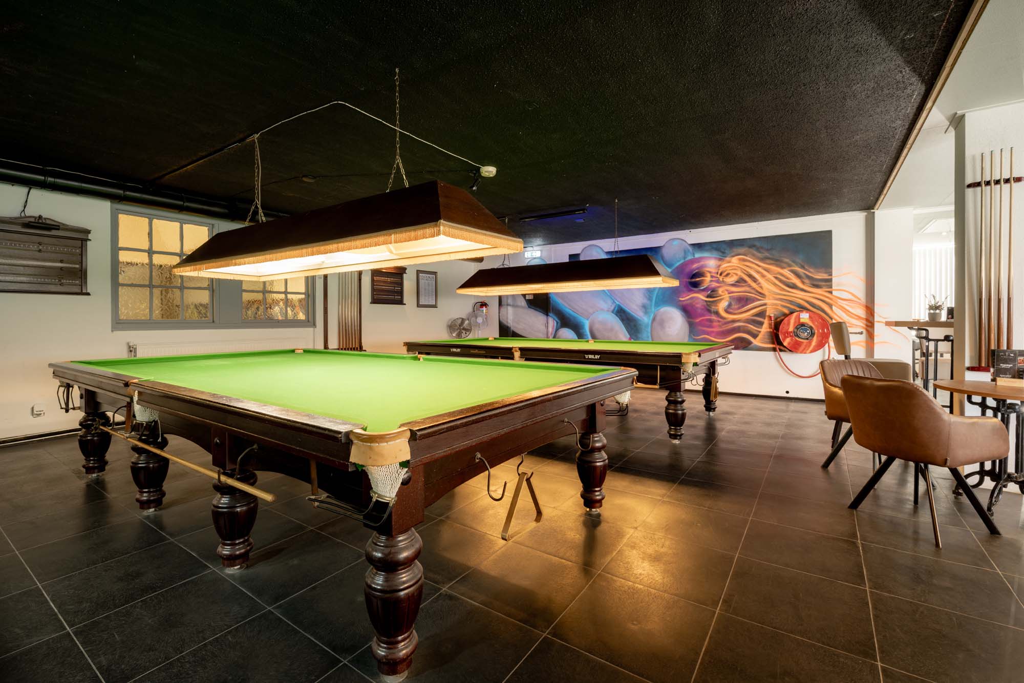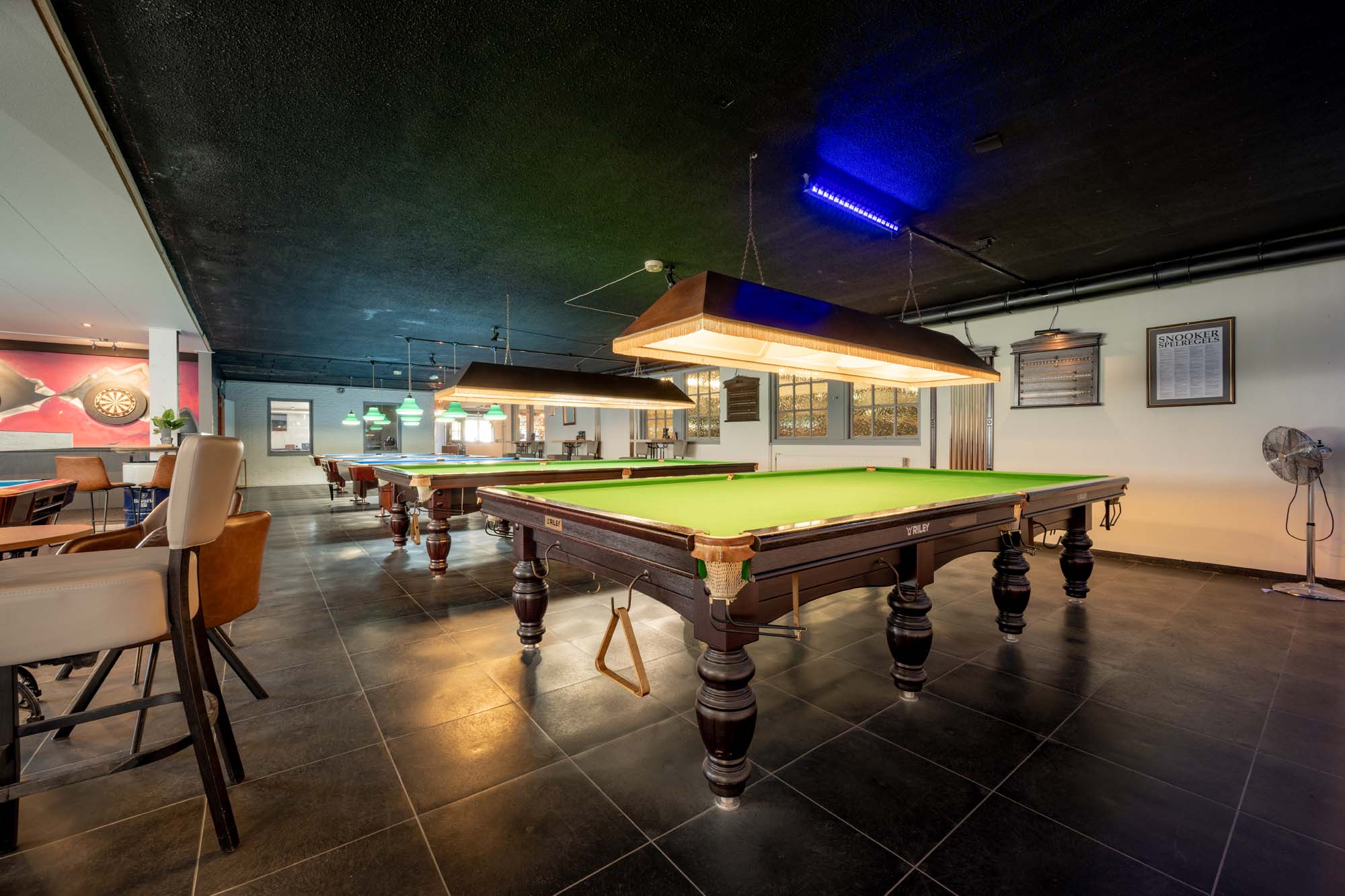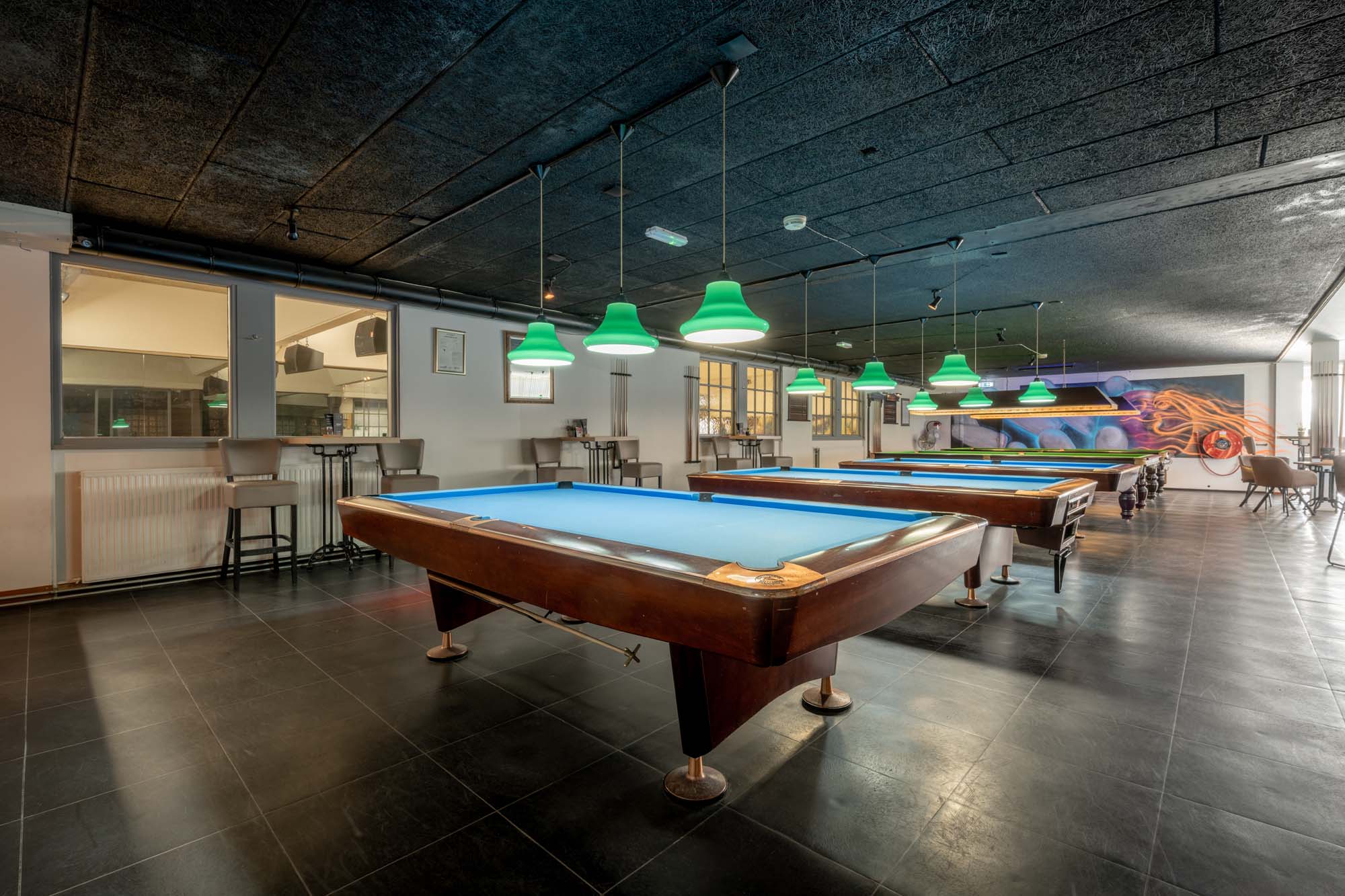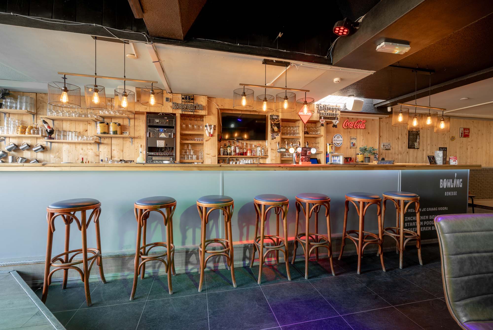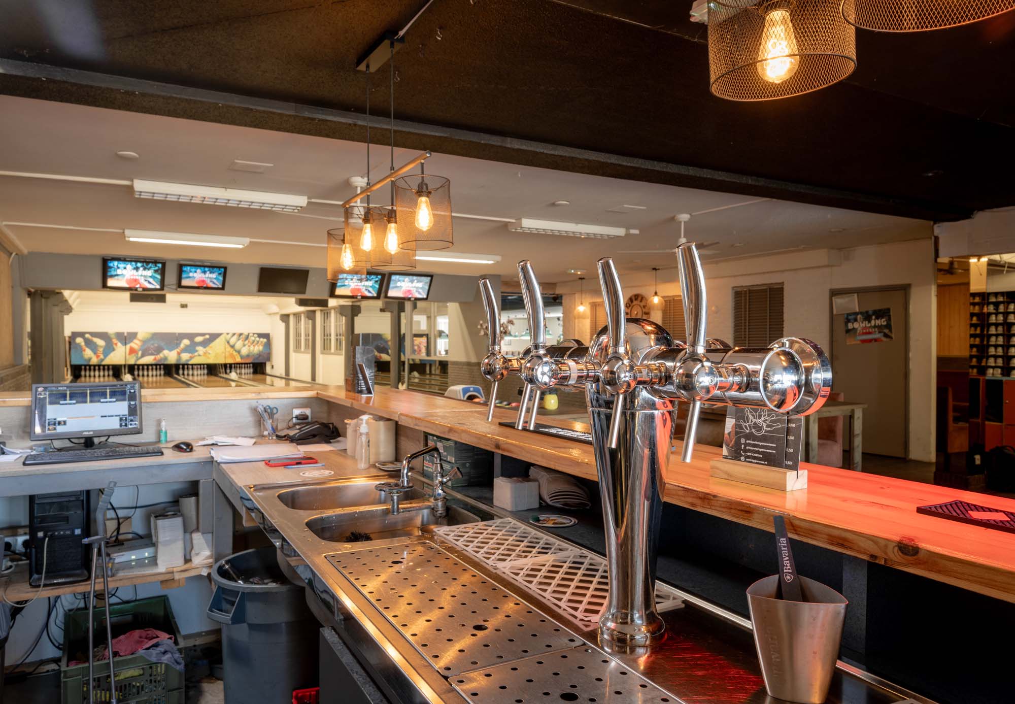 Wie de trap naar de eerste verdieping neemt en rechtdoor loopt komt in een grote ruimte van maar liefst 800 m2. Hier vind je 4 bowlingbanen, 5 pooltafels, 2 snookertafels, 1 biljart en 3 dartborden. Tal van sporten dus op één plek. De bowlingbanen zijn zodanig in trek dat reserveren nodig is. Wat betreft de keusporten, kun je binnenlopen en kijken welke tafel vrij is. Darten kan gratis op elk bord dat vrij is. In deze ruimte vind je daarnaast een aantrekkelijke bar van waaruit iedereen bediend wordt. Daar staat onder andere een goede koffiemachine, muziekinstallatie en vitrinekoelkasten. Je vindt hier een frituurhoek voor de snacks die gasten bij hun drankje kunnen bestellen.