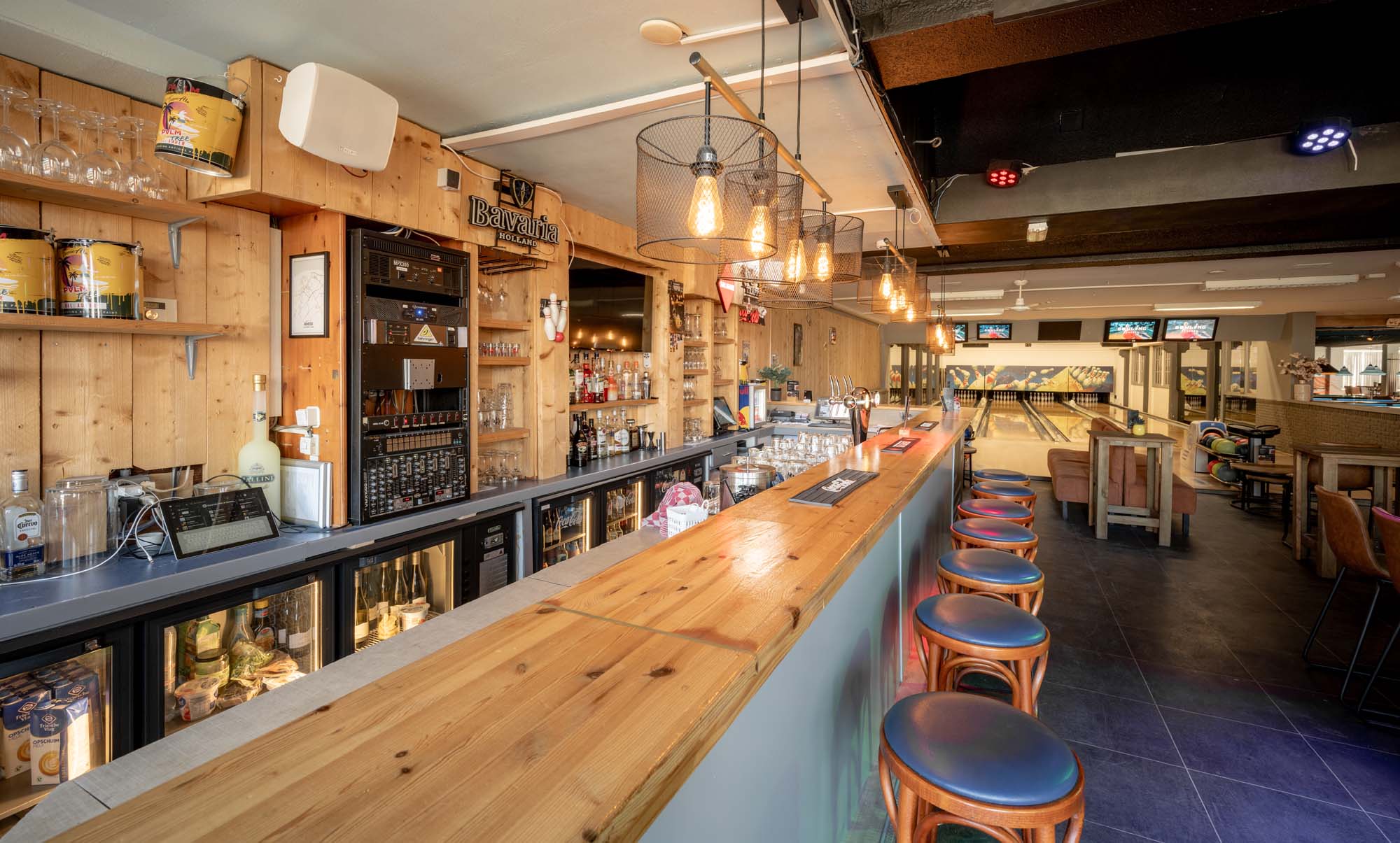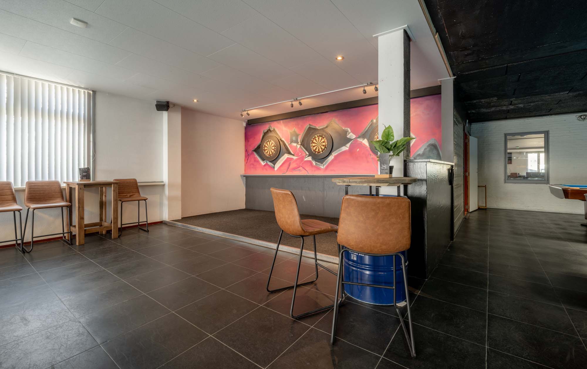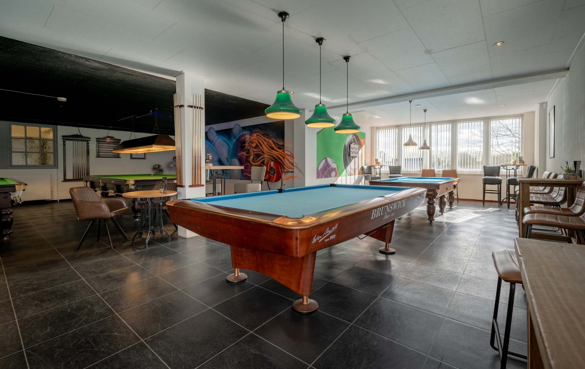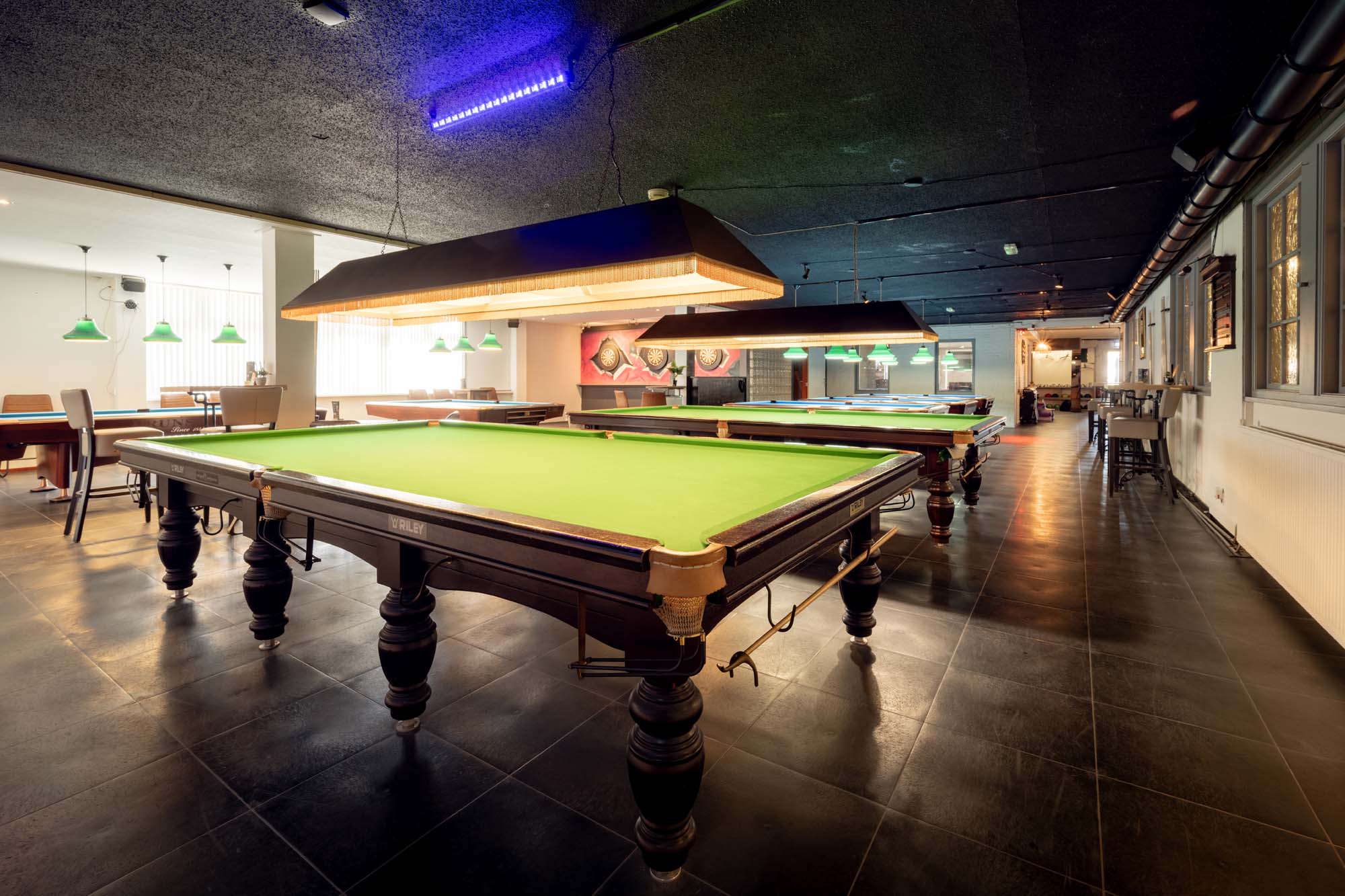 Wie de trap naar de eerste verdieping neemt en rechtdoor loopt komt in een grote ruimte van maar liefst 800 m2. Hier vind je 4 bowlingbanen, 5 pooltafels, 2 snookertafels, 1 biljart en 3 dartborden. Tal van sporten dus op één plek. De bowlingbanen zijn zodanig in trek dat reserveren nodig is. Wat betreft de keusporten, kun je binnenlopen en kijken welke tafel vrij is. Darten kan gratis op elk bord dat vrij is. In deze ruimte vind je daarnaast een aantrekkelijke bar van waaruit iedereen bediend wordt. Daar staat onder andere een goede koffiemachine, muziekinstallatie en vitrinekoelkasten. Je vindt hier een frituurhoek voor de snacks die gasten bij hun drankje kunnen bestellen.