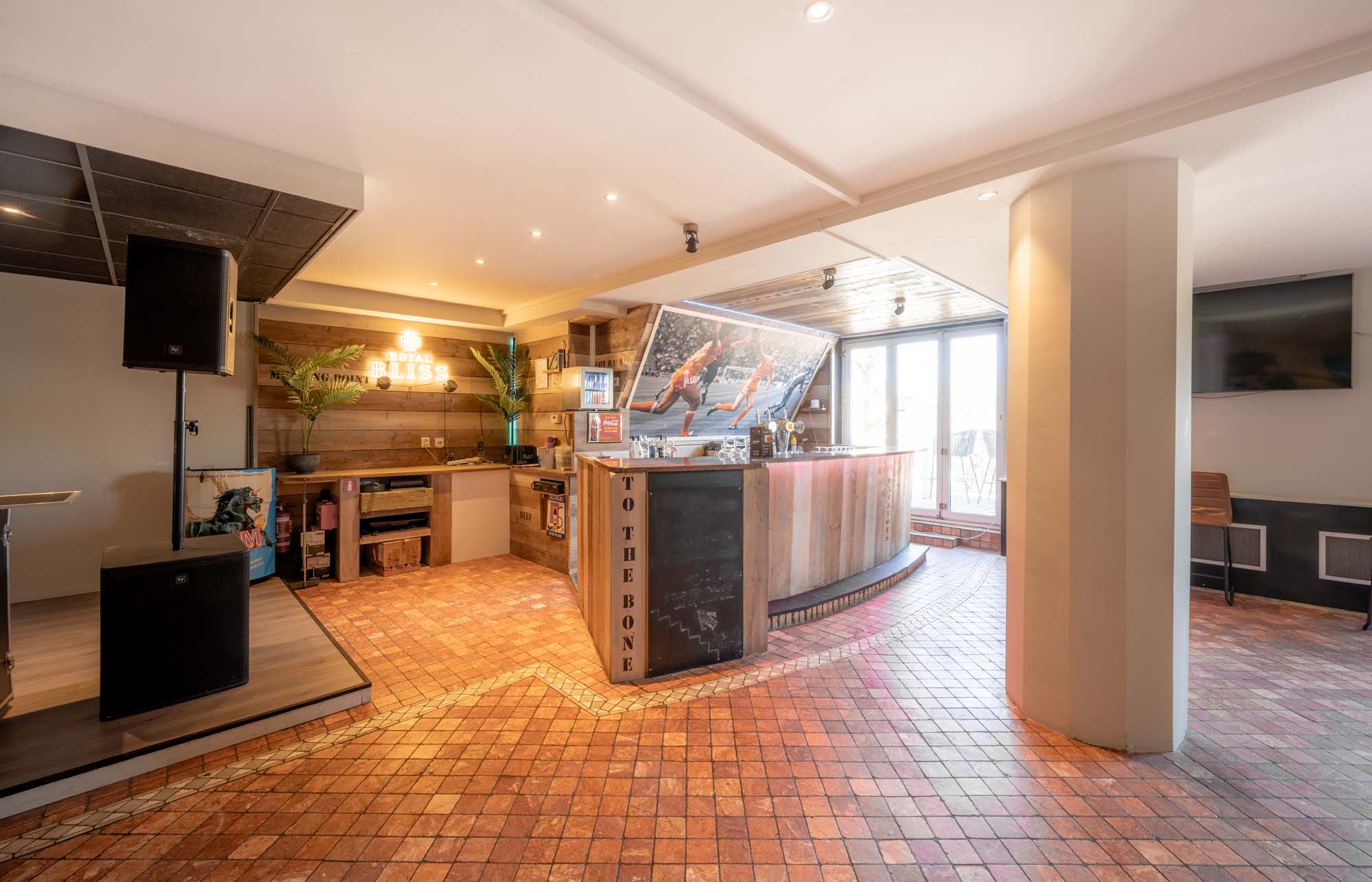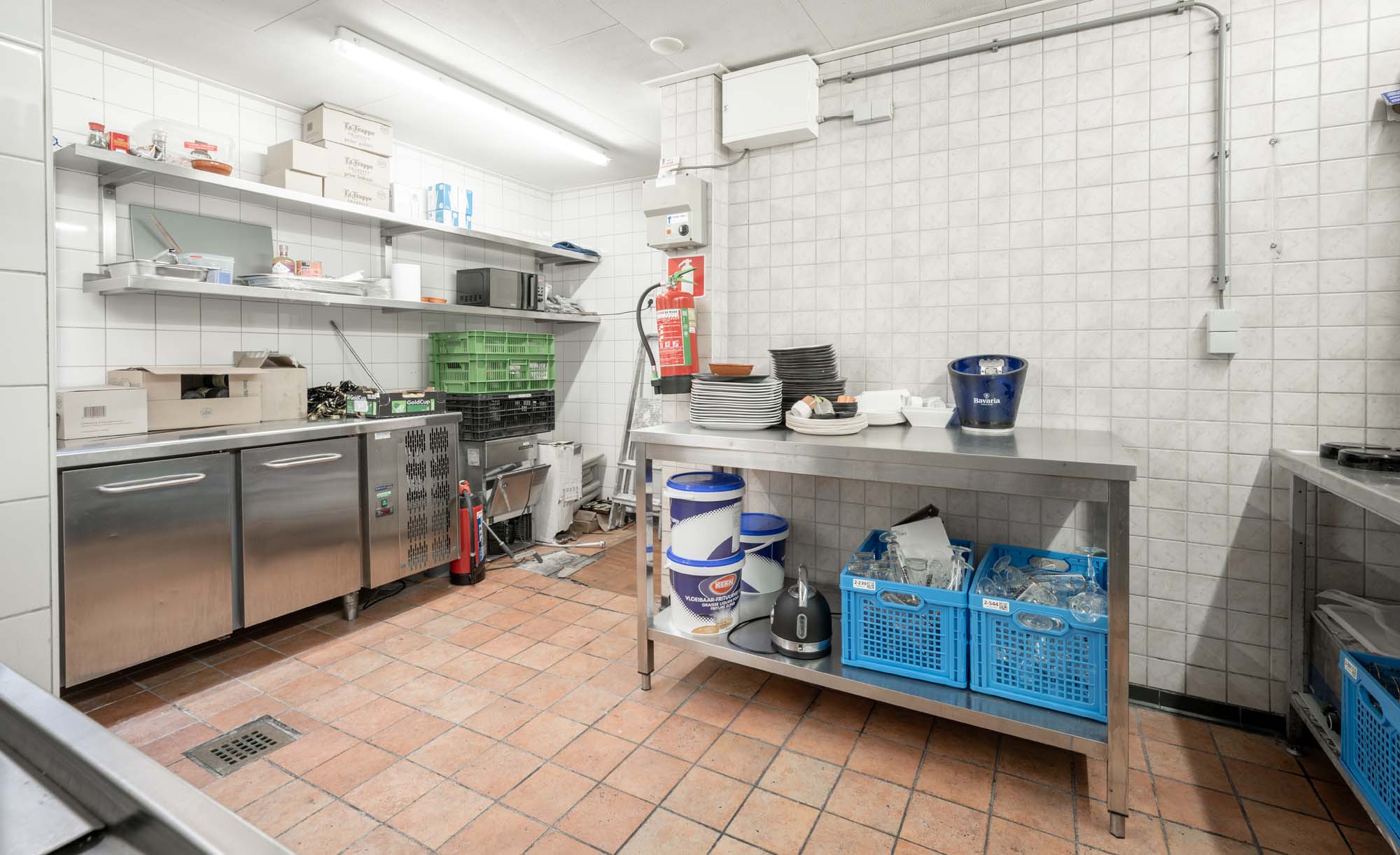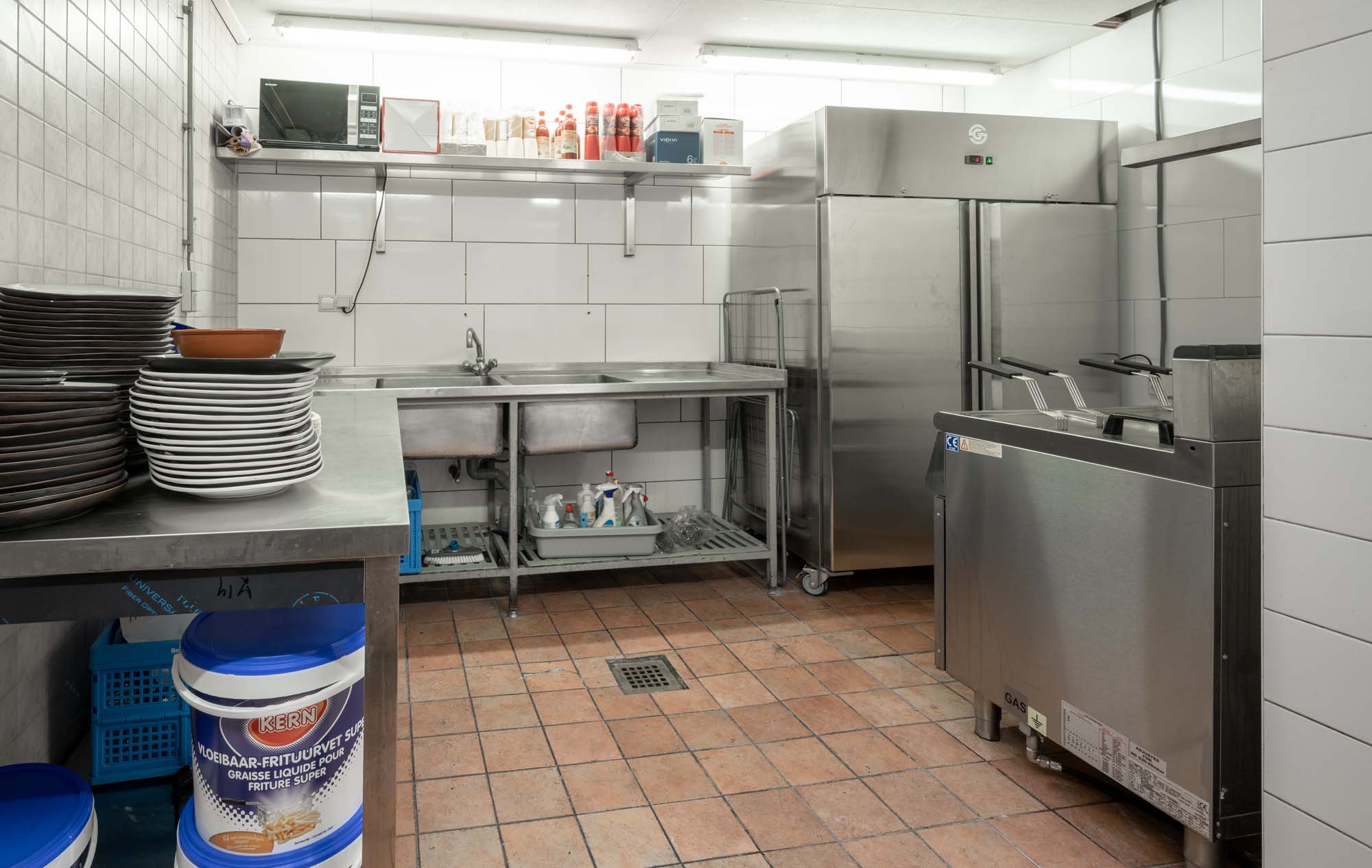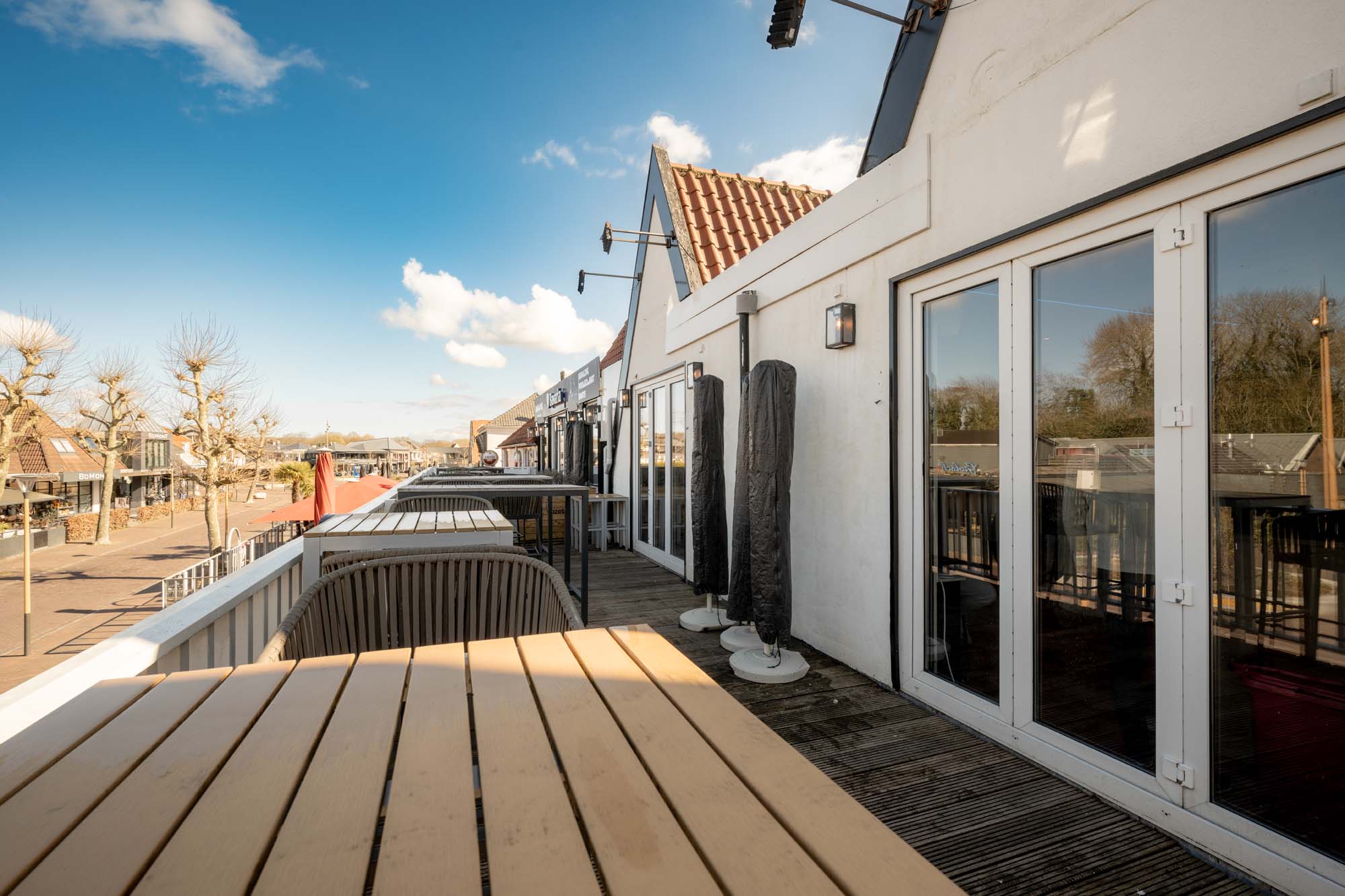 Ga je vanuit de hoofdingang bovenaan de trap rechts, dan kom je in de ruimte die 1 à 2 keer per week gebruikt wordt voor feesten en partijen. Deze kant van de zaak heeft een aparte vergunning voor een restaurantexploitatie. De huidige eigenaren maken daar momenteel geen gebruik van. Hier vind je een flinke bar met onder andere vitrine koelkasten, tapinstallatie met drie aansluitingen, muzieksysteem en een led/discolichtensysteem. De ruimte is recent opgeknapt, maar is, gelet op het huidige gebruik, sober ingericht. Elk feest wordt nu op maat gedecoreerd. Verder is er een keuken, waar onder andere een frituur, koelcel, vriezer, koelbanken en een afwashoek staan. Natuurlijk zijn er aansluitingen voor meer keukenapparatuur. Alle ruimte dus om hier als horecaondernemer je eigen restaurantplannen en -ideeën waar te maken. Daarvoor is zeker nog ruimte in Renesse. Naast de binnenruimte is er tevens een dakterras waar plaats is voor ongeveer 30 gasten.