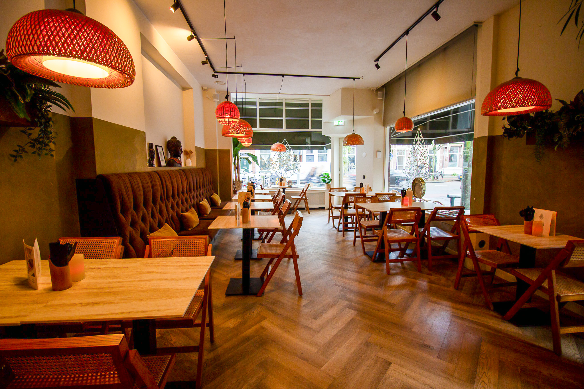 Aan de voorzijde van het hoekpand bevindt zich een gezellig terras. Aan beide zijden van het object ligt namelijk het ruime (gevel)terras. Dit is bij uitstek de plek om met lekker weer neer te strijken. Bij binnenkomst is de sfeer meteen te voelen door het warme, sfeervolle interieur. Houten tafels, mandjes, palmbladeren als decoratie, subtiele verlichting, het voelt intiem en huiselijk.