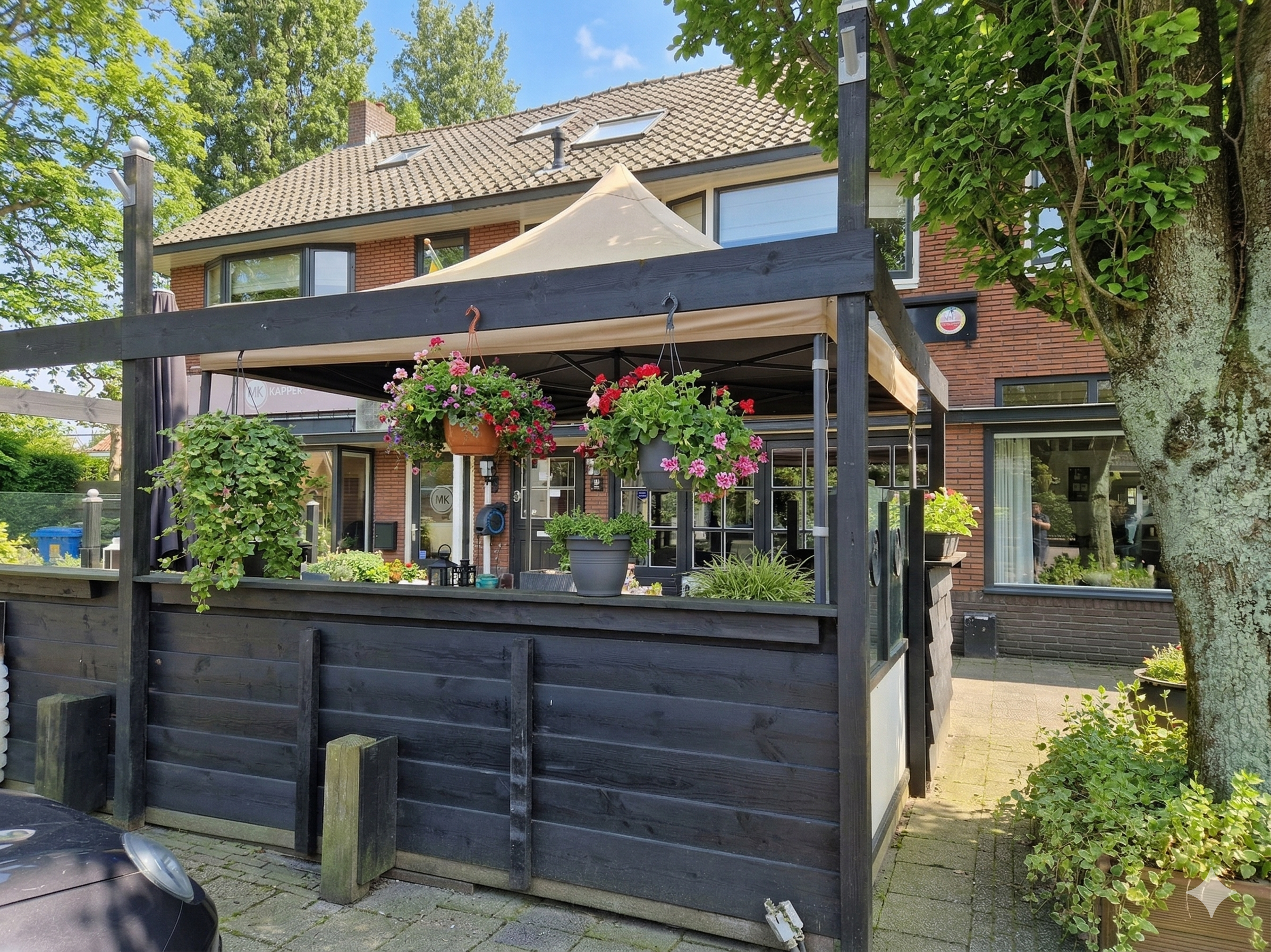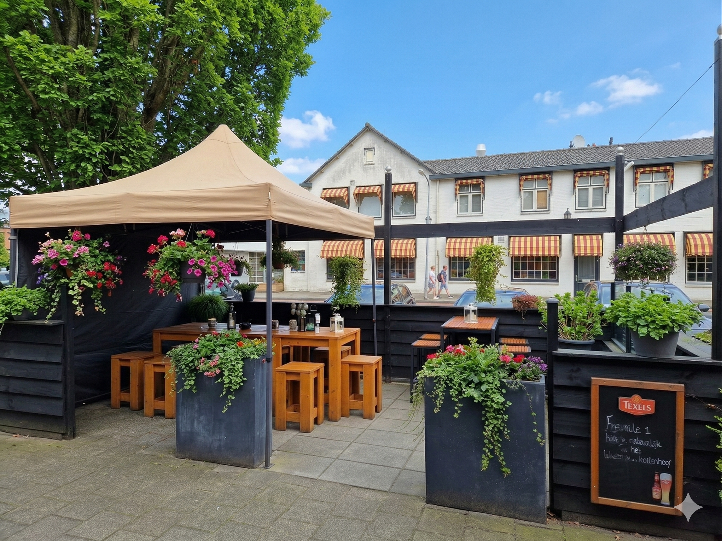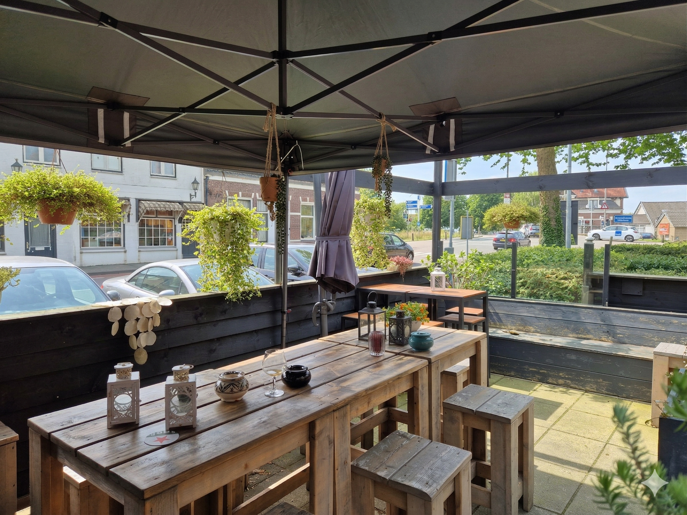 Aan de buitenzijde bevindt zich een beschut terras dat privacy en comfort biedt en functioneert als een volwaardig verlengstuk van de exploitatie gedurende het seizoen.